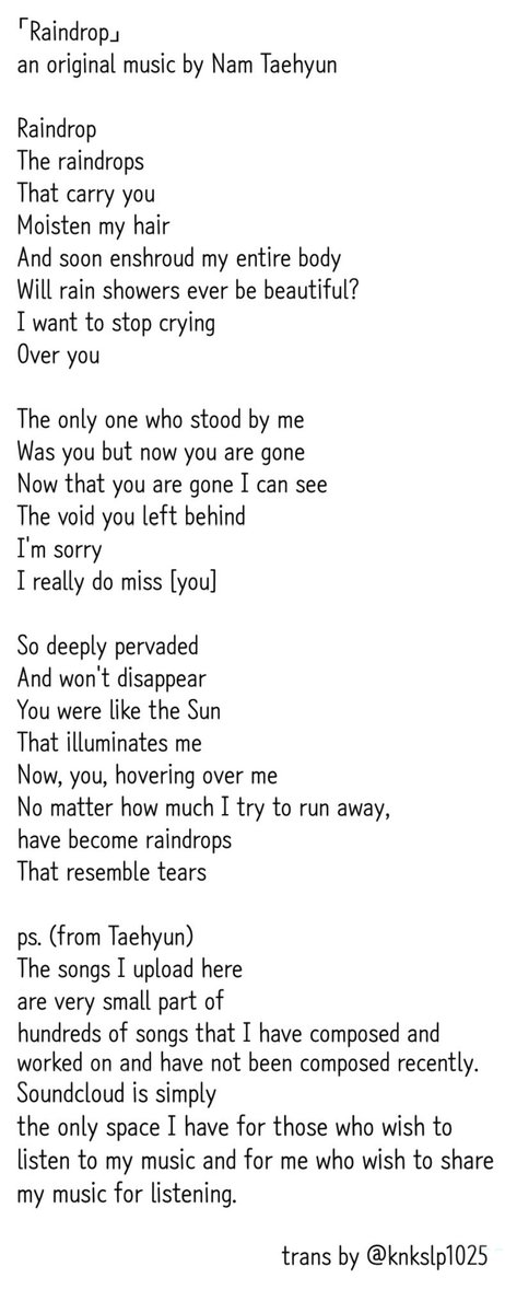 Maran Amaranthine On Twitter Trans Lyrics Of Raindrop By Nam Taehyun Posted On Soundcloud 161014 Ics Plz Don T Make Speculations Or Over Interpret His Lyrics Https T Co Wl7qcgu4rf